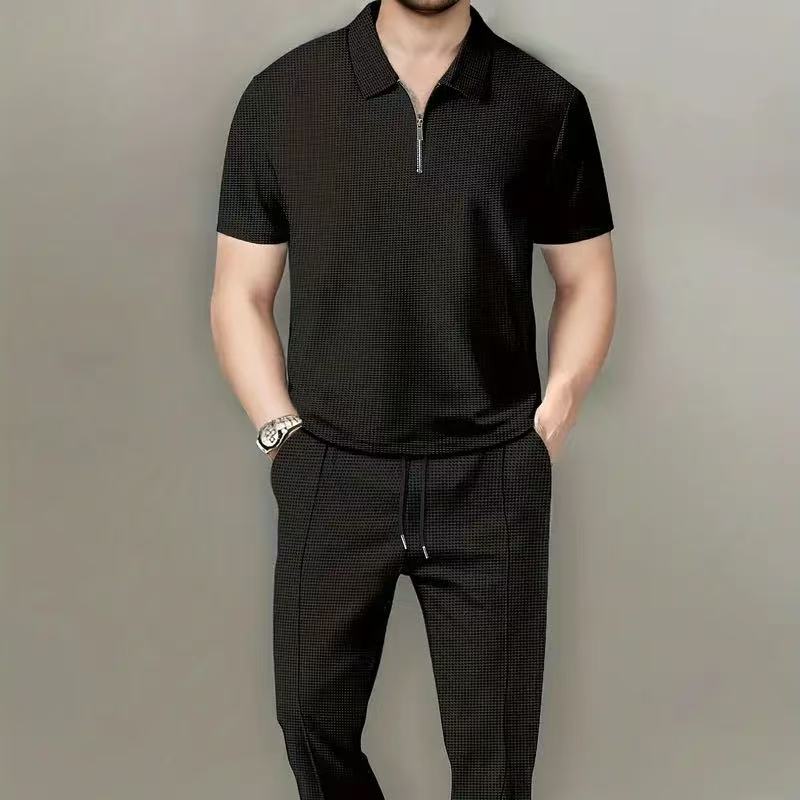 2025 autumn new European and American foreign trade men's solid color suit waffle lapel short sleeve zipper trousers suit